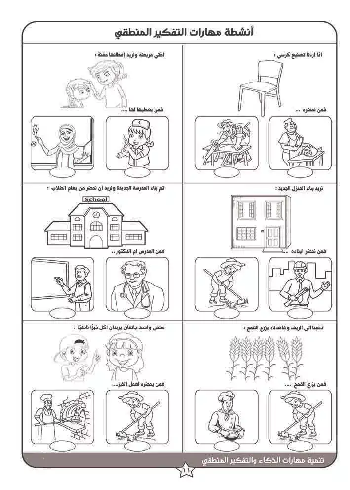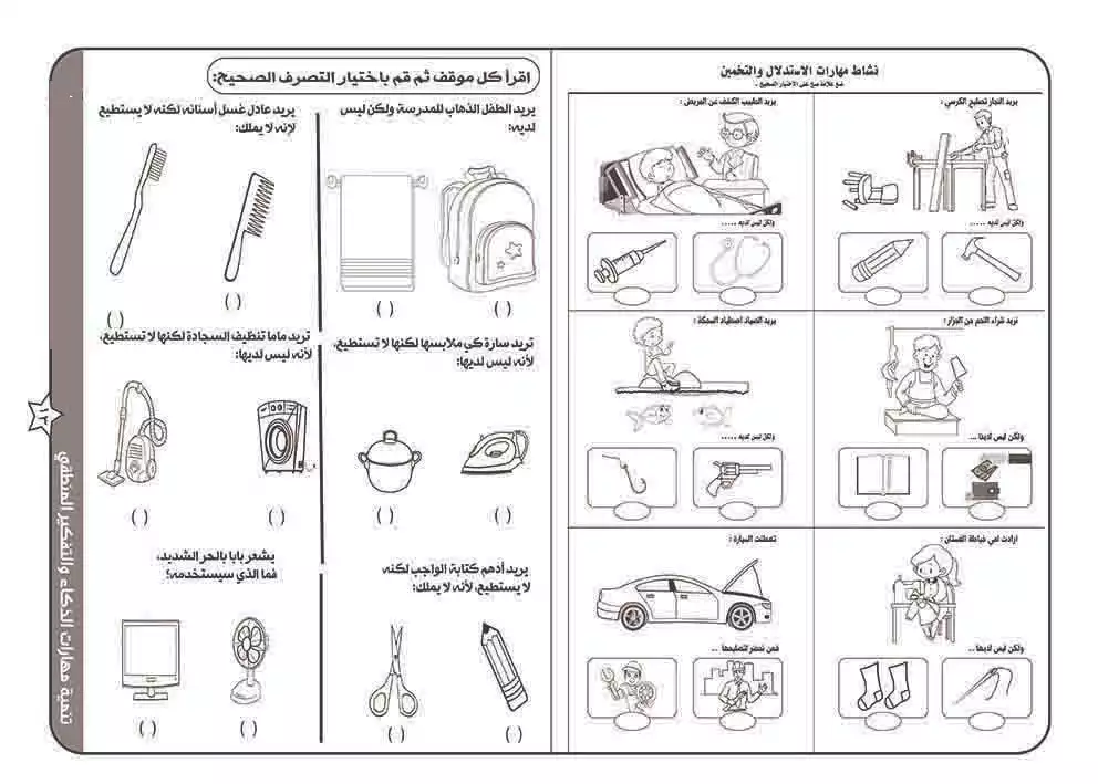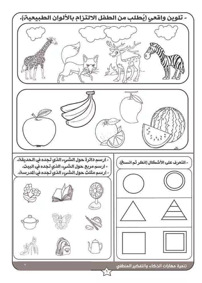 مهارات التصنيف والشكل والظل والتوصيل والمتاهات والاختلافات والمعكوسات.