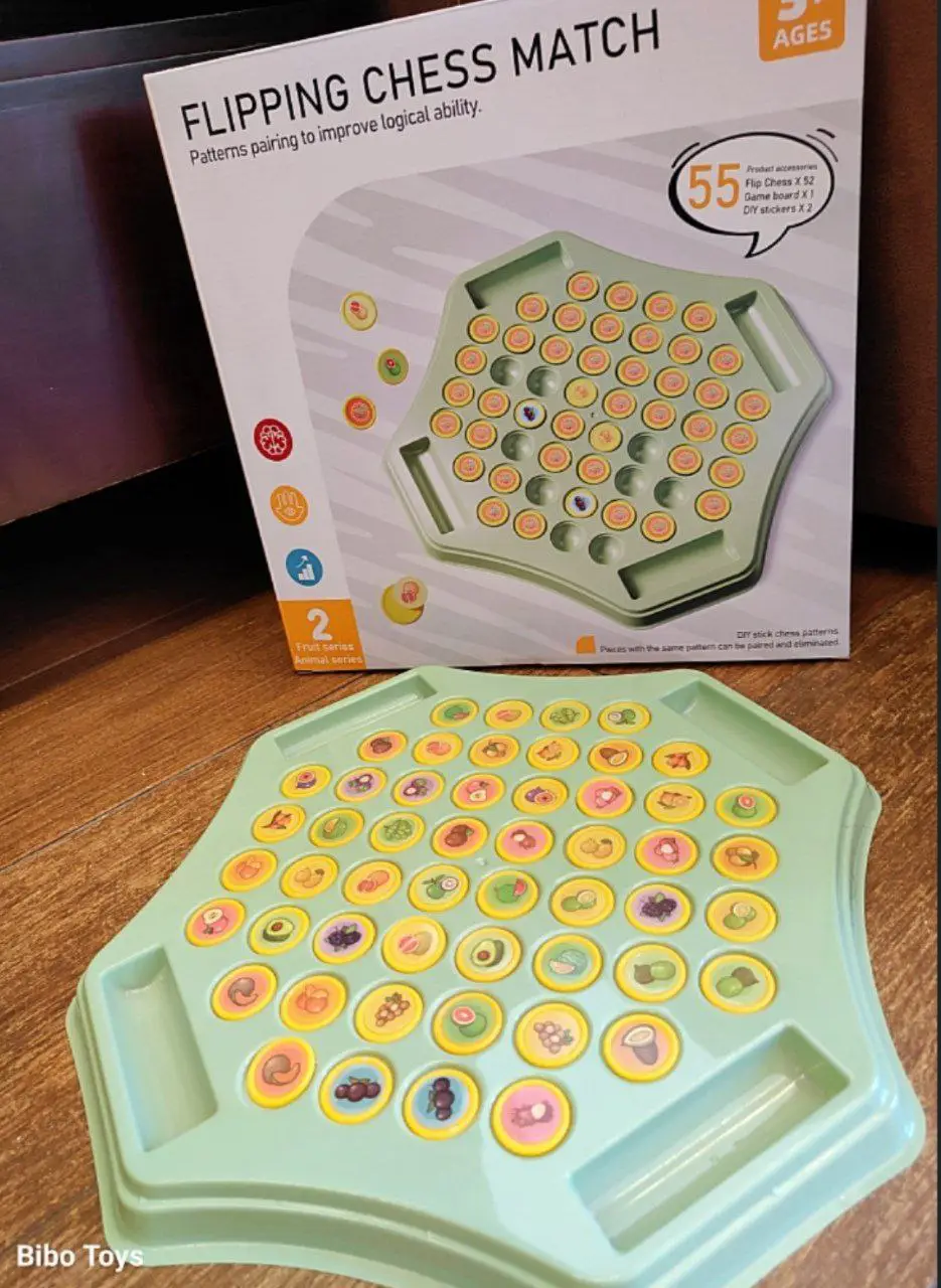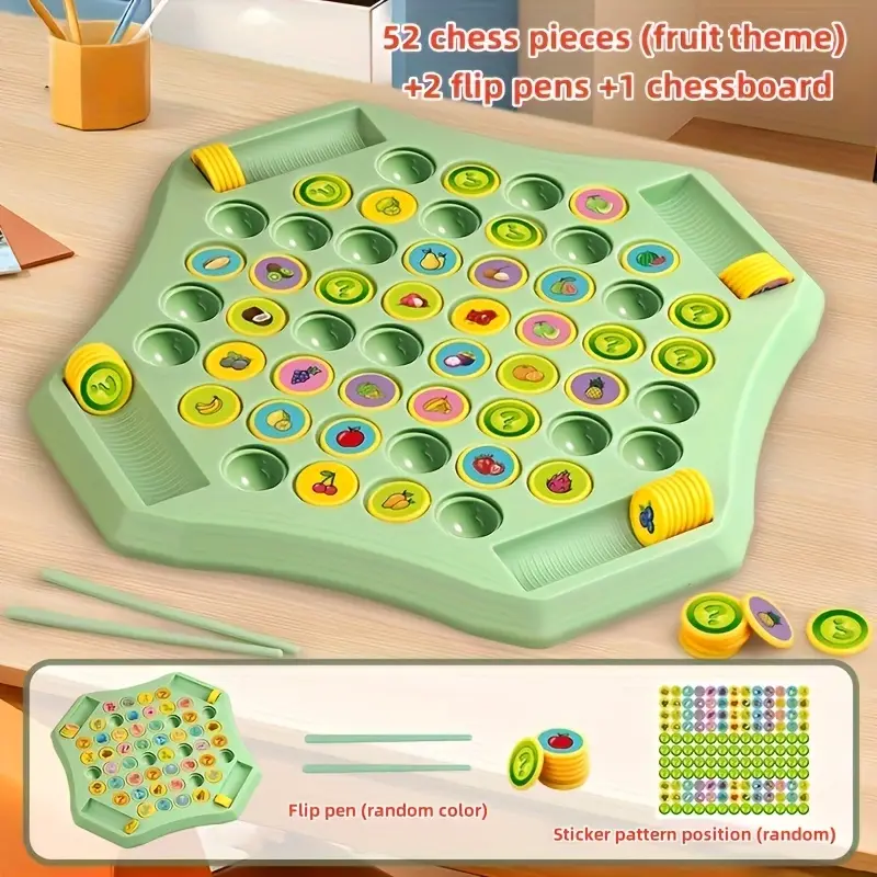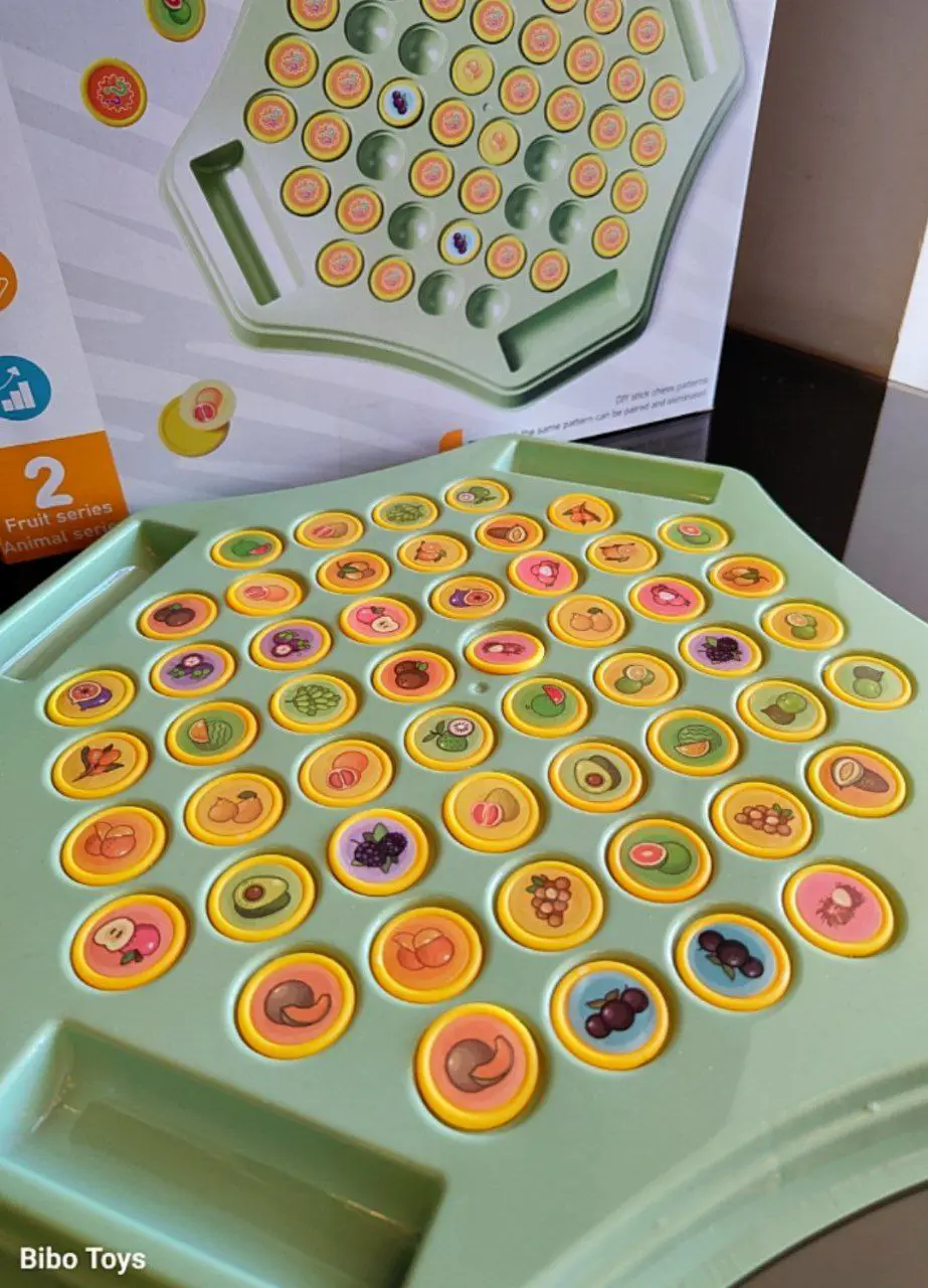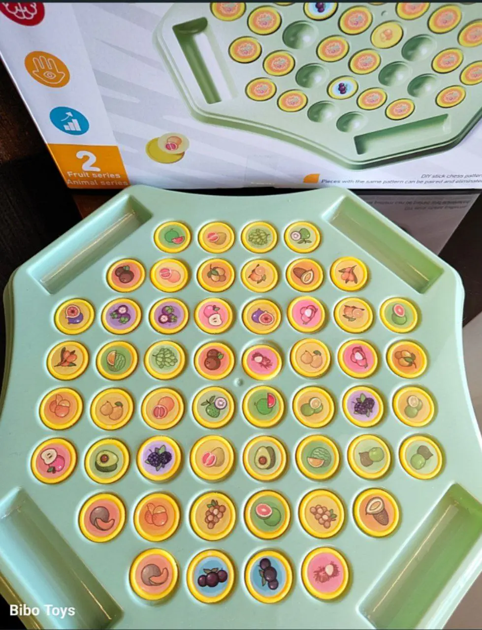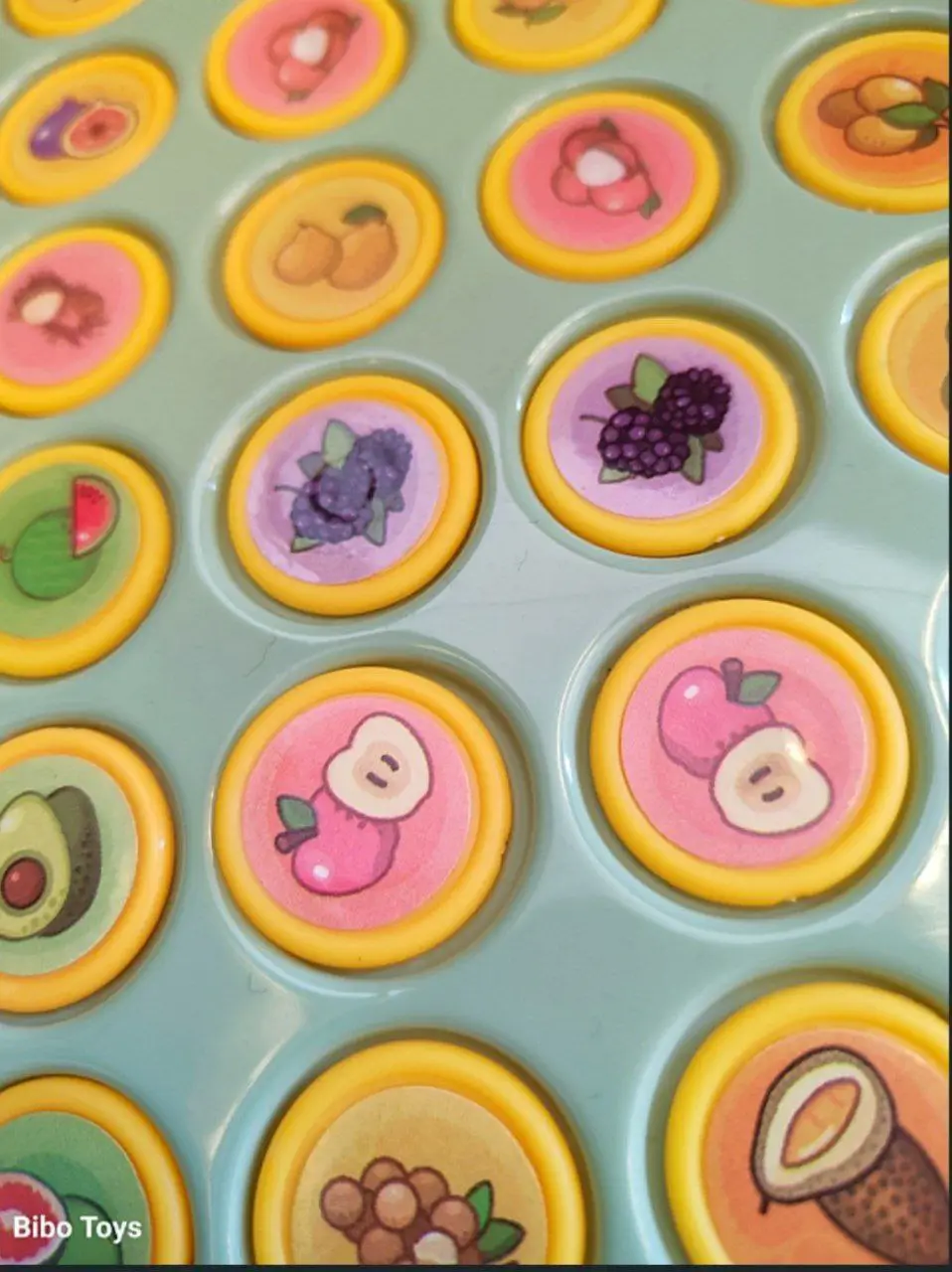 🍎 اللعبة عبارة عن بورد مع 55 قطعة على شكل فواكه ملونة