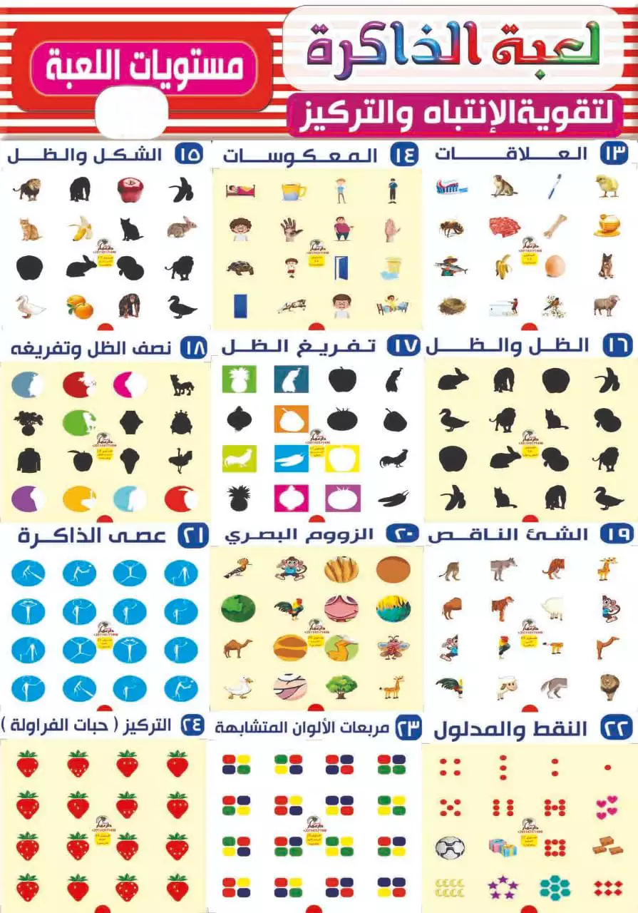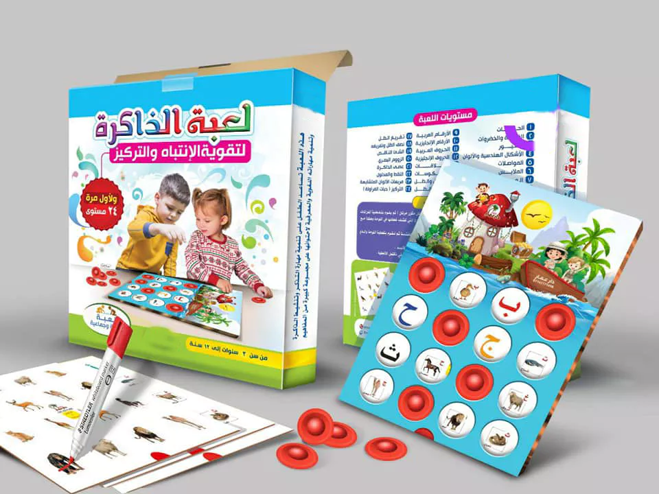 🧠 لعبة الذاكرة المذهلة: تتضمن لعبة الذاكرة 24 مستوى متدرج من الأسهل للأصعب، مما يتيح للأطفال تحديات مستمرة تناسب جميع الأعمار. تحتوي اللعبة على بطاقات مسلفنة وجه وظهر، ومنتج خشبي يحتوي على 16 خانة توضع بداخلها الكروت ومعها 16 غطاء بلاستيكي.