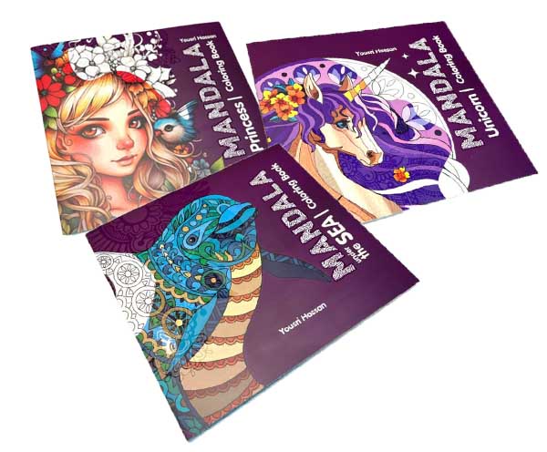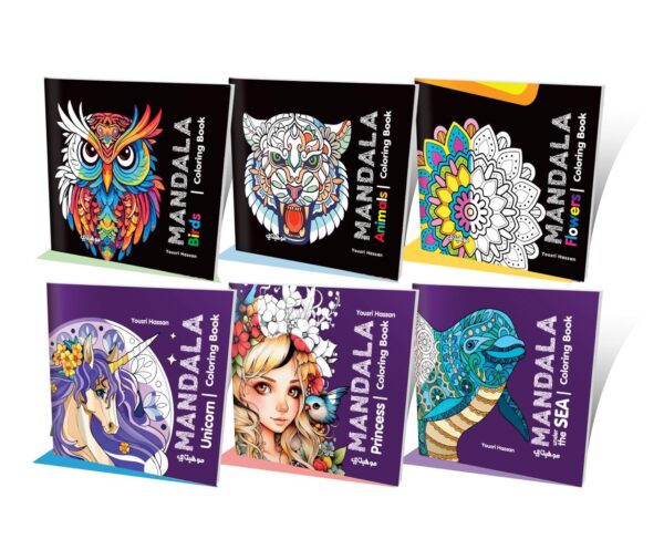 6 كتب تلوين مانديلا للكبار والصغار ( ورود – طيور – حيوانات- اميرات – تحت البحر – يوني كورن )