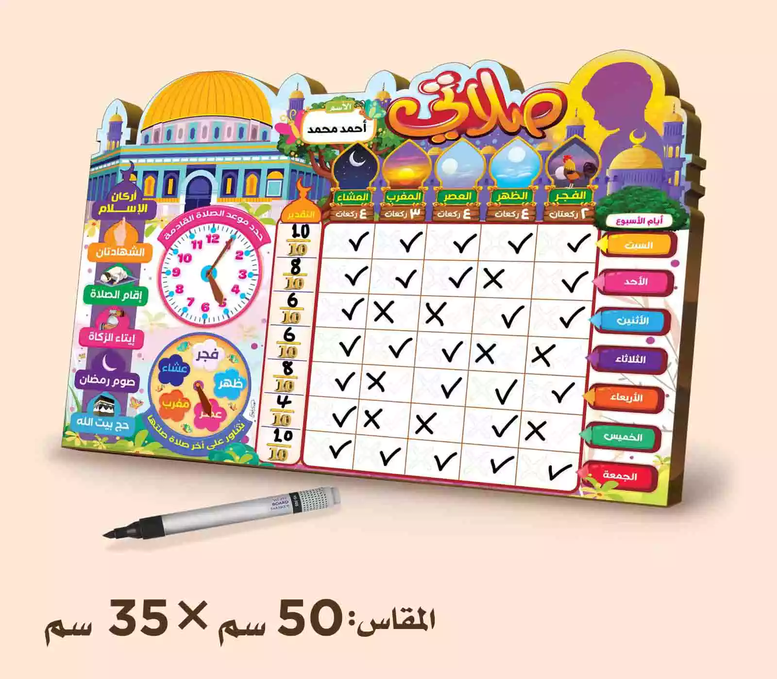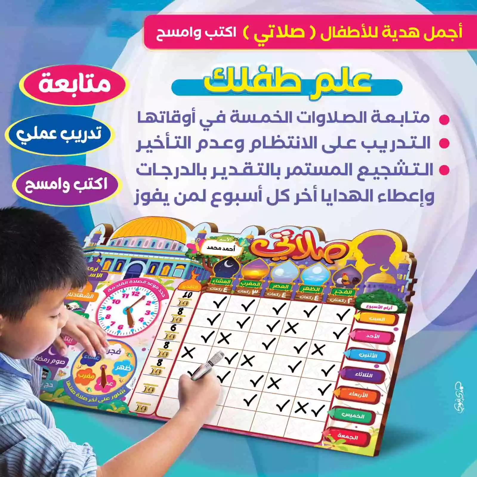 وكمان فيها ساعه عشان الطفل يحدد ميعاد الصلاه القادمه حتى يتعلق قلبه بالمسجد