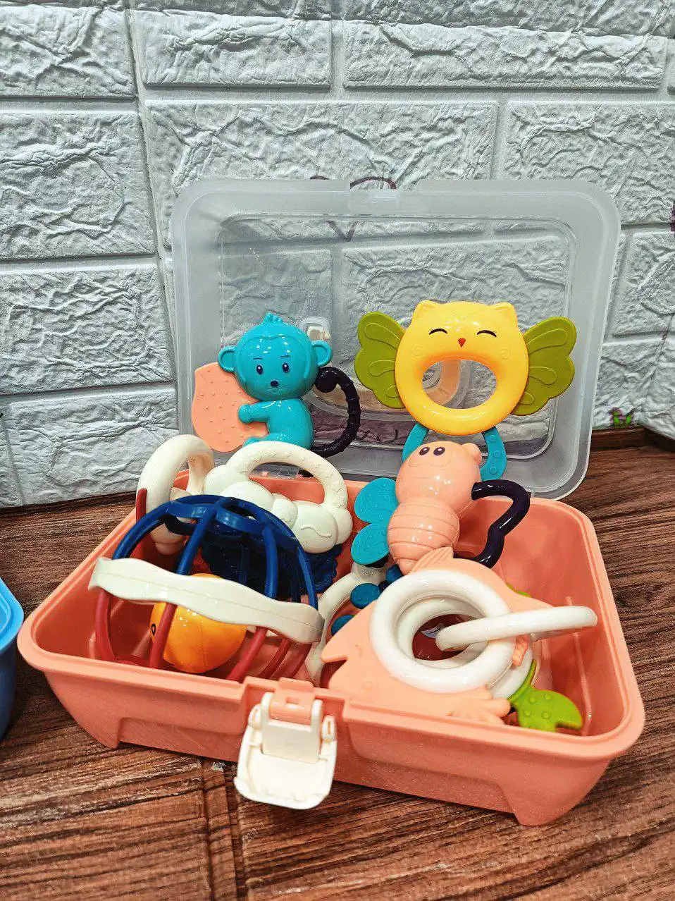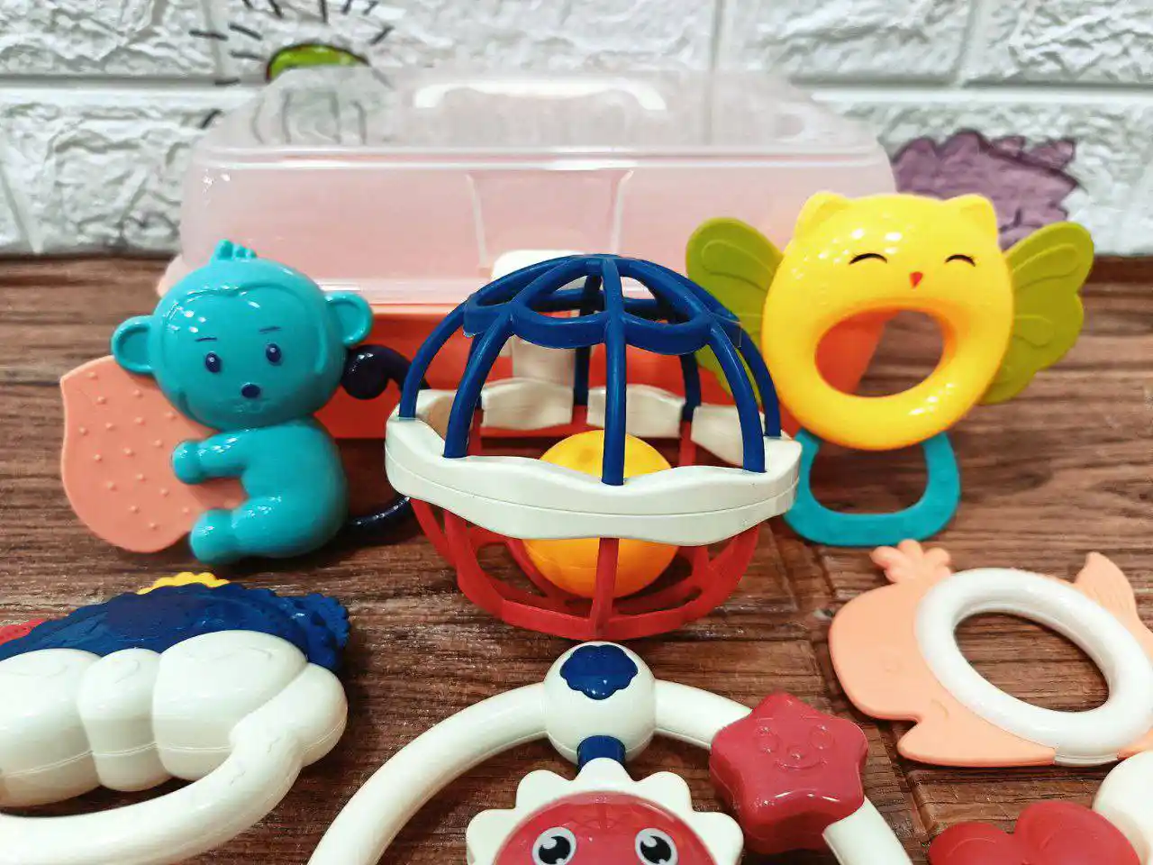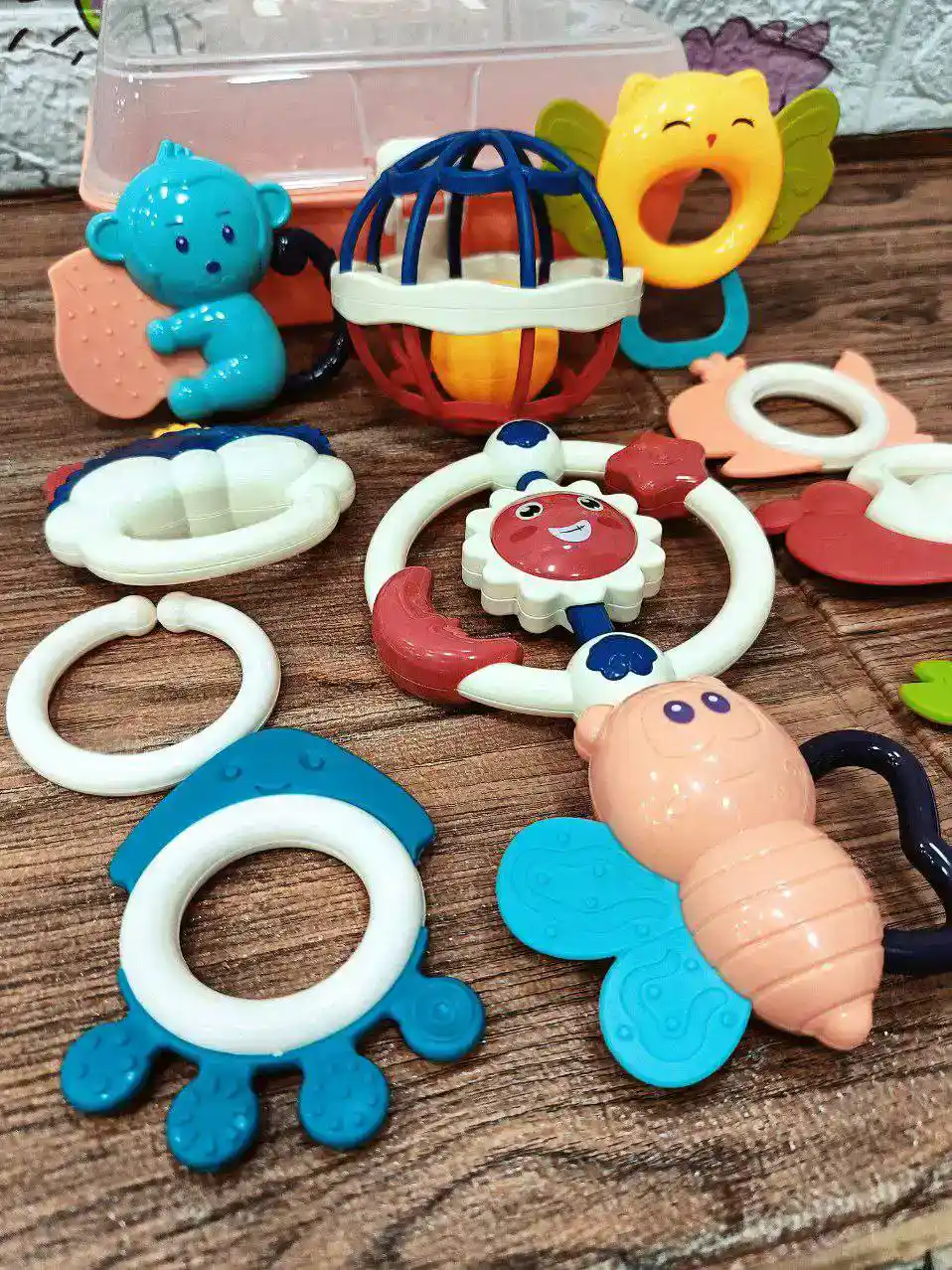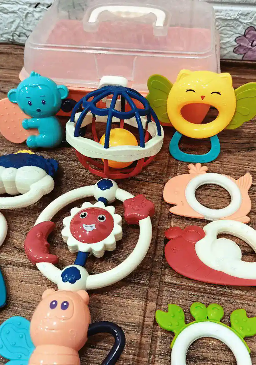 🧸 ١١ قطعة متنوعة بين عضاضات وشخاليل وكورة سيليكون ناعمة