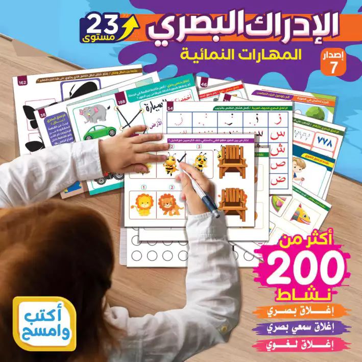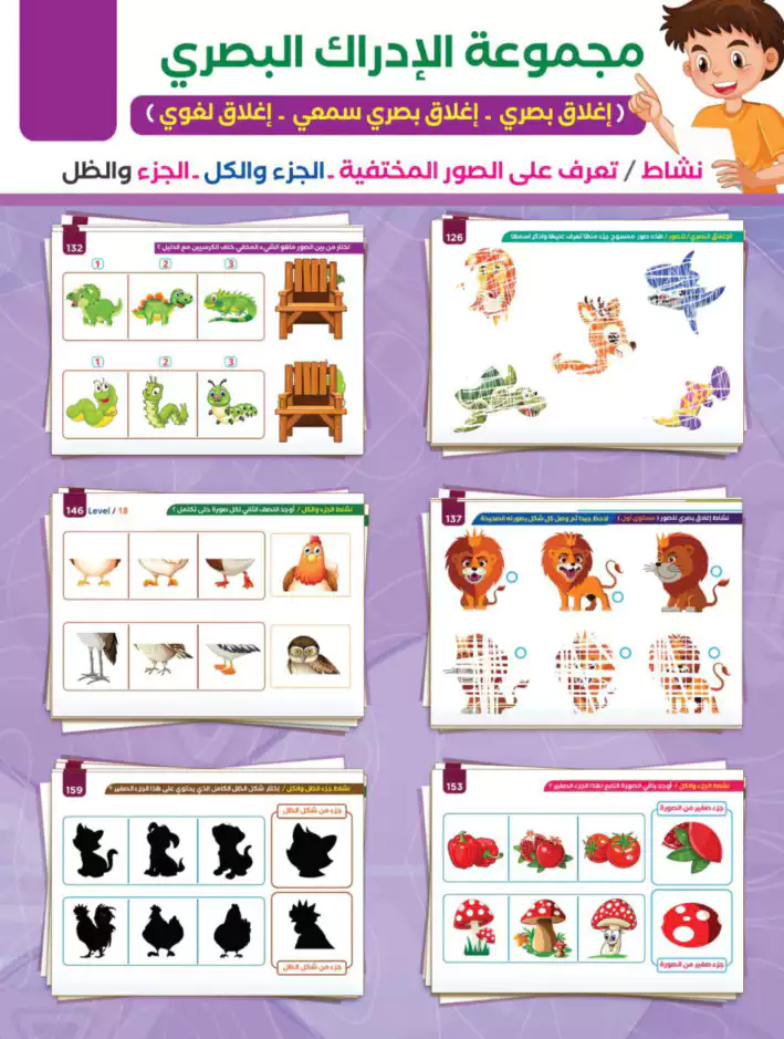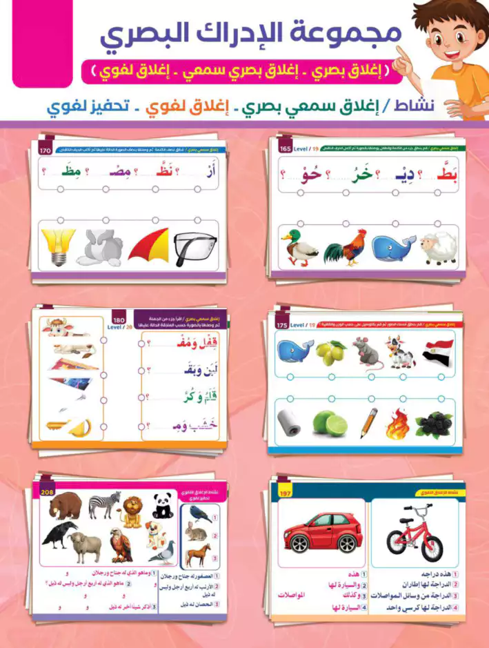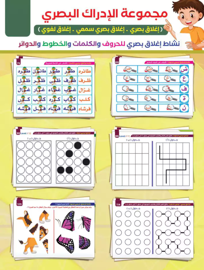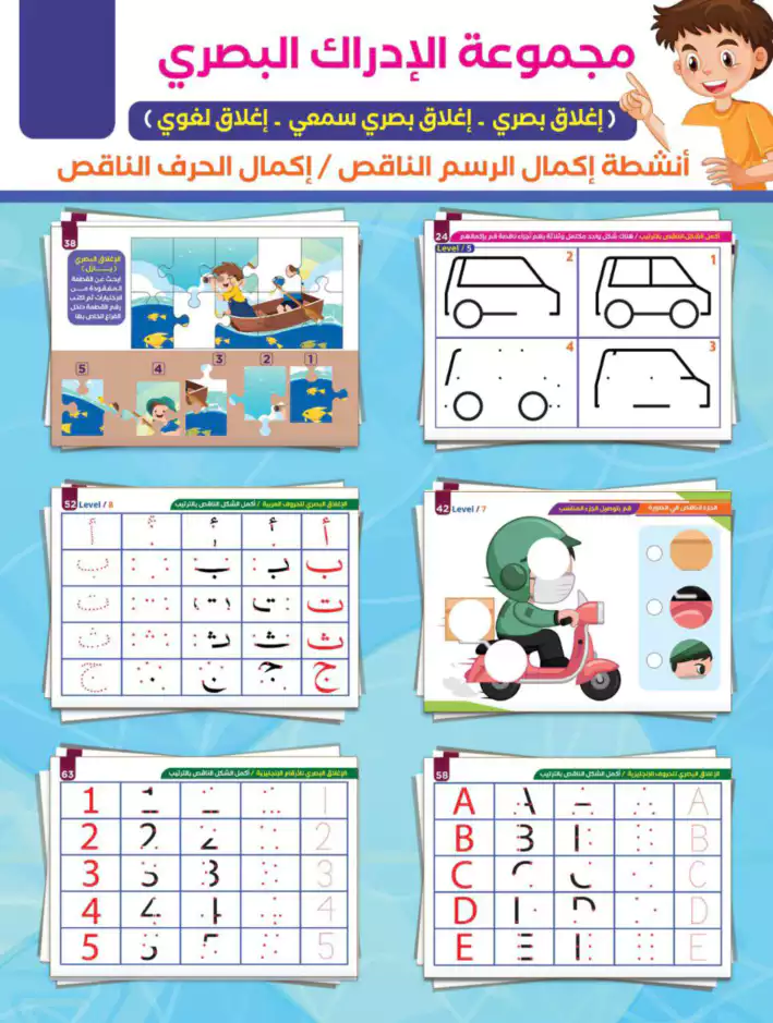مجالات متعددة: تشمل الأنشطة مجالات مثل الإغلاق البصري، الإغلاق السمعي بصري، الإغلاق اللغوي، وتحفيز اللغة، بالإضافة إلى نسخ وتقليد الأنماط. هذا التنوع يساعد في تطوير مهارات متعددة لدى الأطفال.